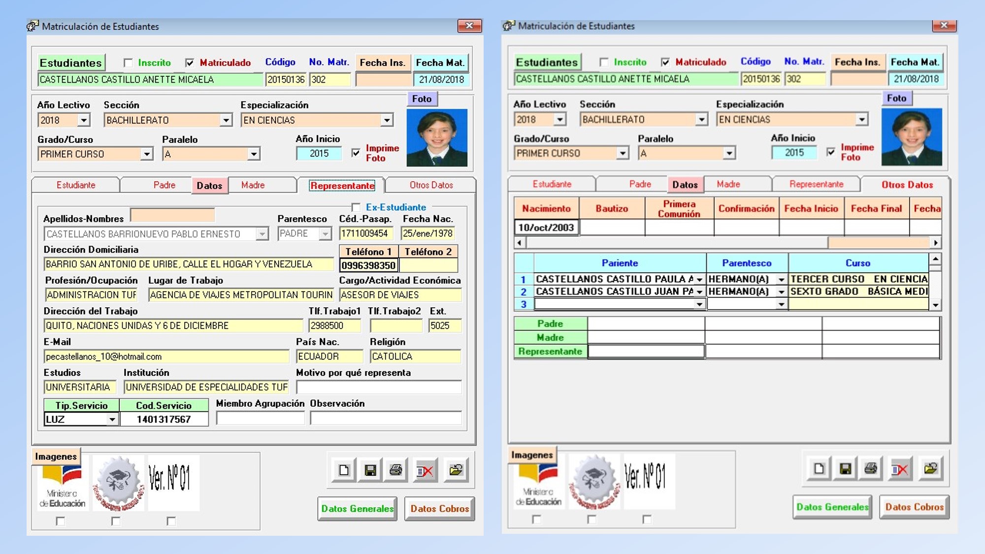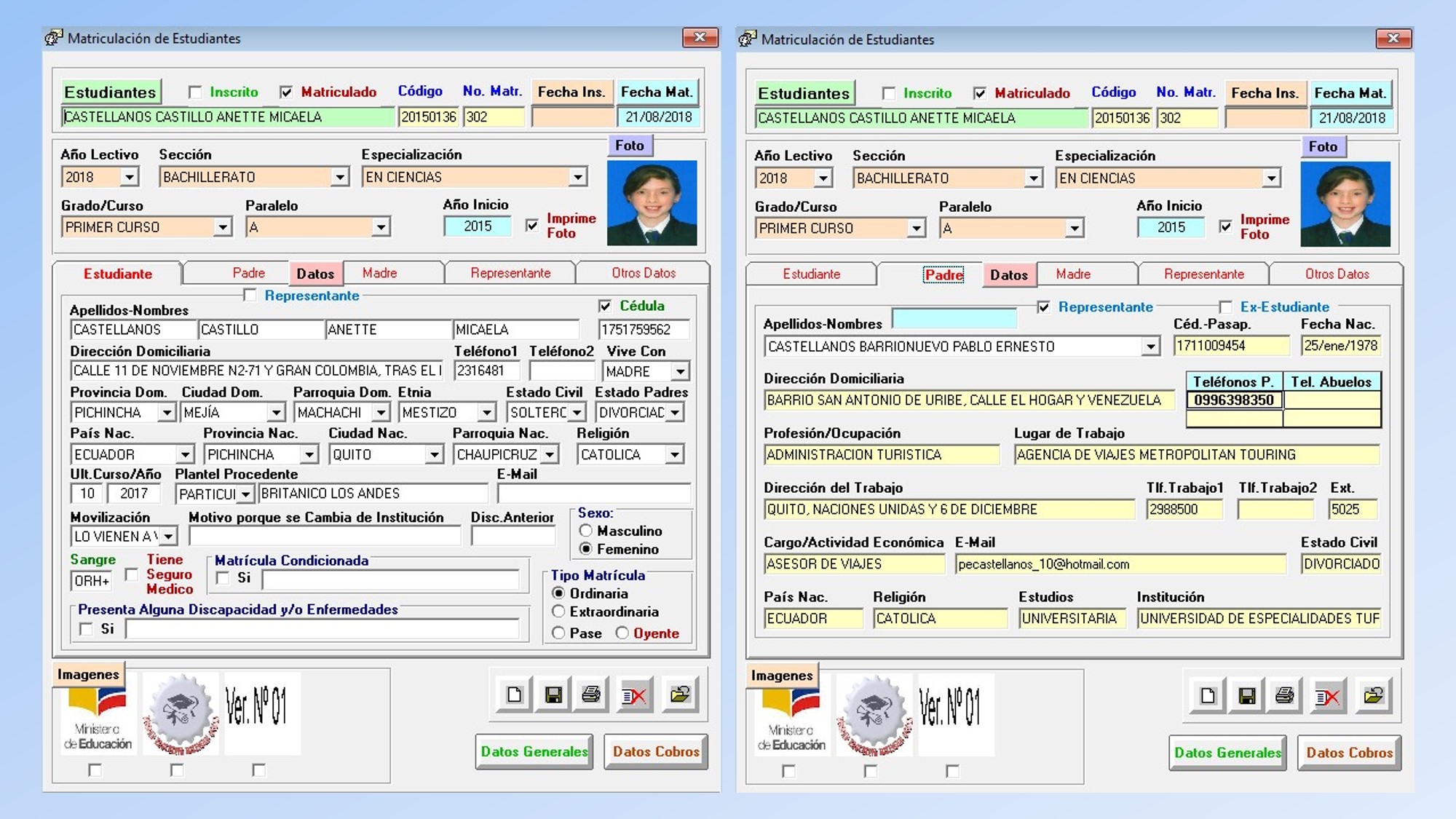 Matriculación: Datos del Estudiante, Datos de los Padres, Datos de Representante,