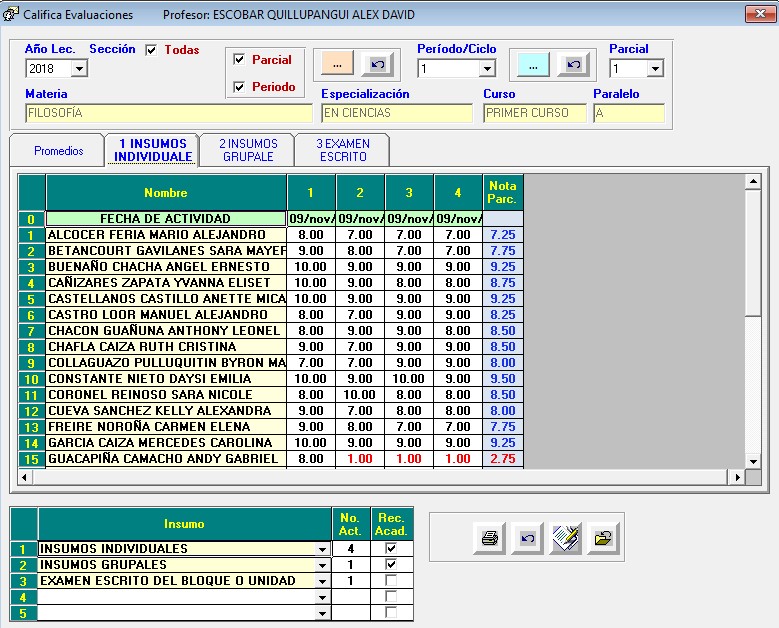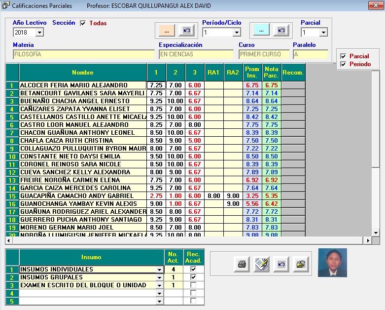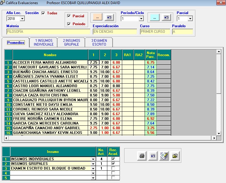 Cuadro de Calificaciones por Insumos, Cuadro de Calificaciones por Parcial, Cuadro de Calificaciones