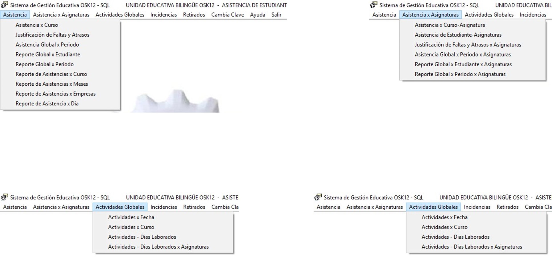 Reporte Global por Estudiante, Reporte Global por Periodo, Reporte de Asistencias